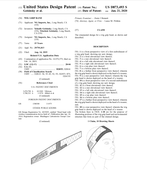 检索发现,NG Imports注册有3个专利,专利号分别为D873493、10881159和10945477。