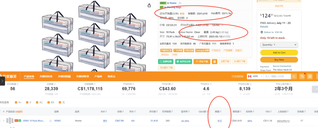单量:在卖家精灵中显示上架时间是2023年05年12号,目前为止持续销售417天,30天销售量612单