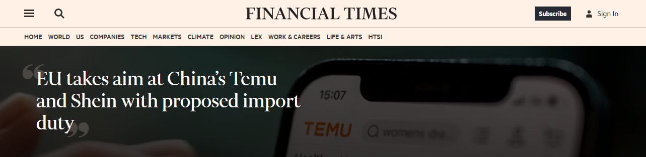 虽然这一新规定将适用于所有欧盟以外的地区,但《金融时报》指出,此举主要还是针对来自中国的Shein、Temu和速卖通等平台。此前由于通货膨胀和不确定性增加,越来越多消费者开始寻找便宜货,以Temu为代表的电商平台飞快增长。
