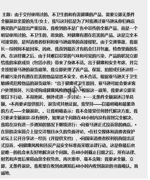 2. 要求无条件退款:不退货,或要求卖家承担退货的运费和税费。正常情况下,买家在平台规定时间内是可以退货的(印象中好像是三十天内),但一旦超出时限,或退货需要承担费用,他们就开始恶意夸大问题,逼迫卖家退款(类似之前不退货就给差评威胁的套路)。