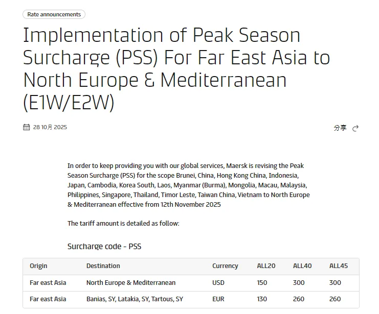 此外,2025年11月1日,马士基将调整远东亚洲至中东的旺季附加费PSS,征收300美金。