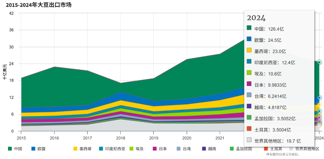 大豆贸易格局中国是美国大豆的最大购买国。根据美国农业部(USDA)数据显示,2024年美国全年出口大豆总额为244.7亿美元,其中,出口至中国大豆总额为126.4亿美元,占比高达51.66%。